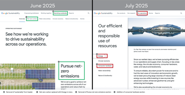 Trên website này, mục Hoạt động bền vững (Operating sustainably) đã được đổi tên thành Hoạt động của chúng tôi (Our operations), và tiểu mục phát thải carbon ròng bằng 0 (Net-zero carbon) đã bị xóa. Thay vào đó, Năng lượng (Energy) được bổ sung thay thế, trở thành lĩnh vực đứng đầu trong hoạt động bền vững của Google.