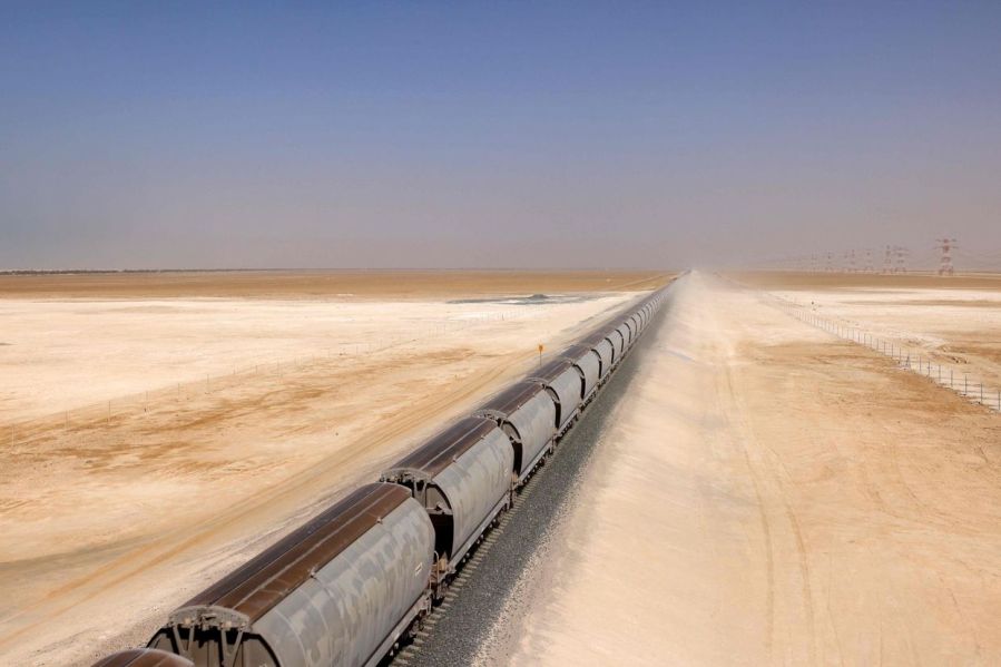 Một chuyến tàu chạy qua thành phố Al-Mirfa của UAE. Dự án vận chuyển kết nối Ấn Độ-Trung Đông bao gồm tuyến đường sắt kết nối Saudi Arabia, UAE và có thể cả Israel. Từ đây, hàng hóa có thể đưa lên tàu biển để đến Ấn Độ và châu Âu. Ảnh: Getty
