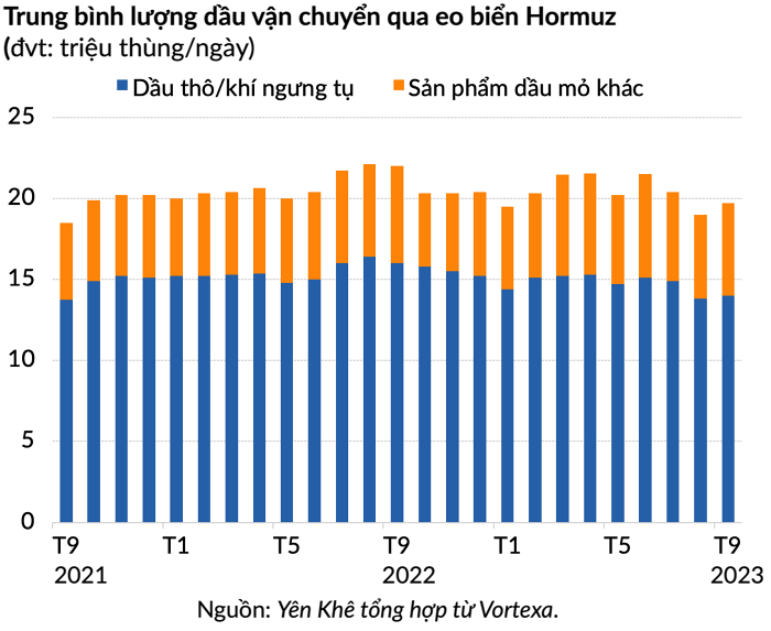 Dữ liệu từ hãng phân tích Vortexa cho thấy, trong 9 tháng đầu năm nay, trung bình mỗi ngày có khoảng 20,5 triệu thùng dầu thô, khí ngưng tụ và các sản phẩm dầu mỏ khác đi qua Hormuz.