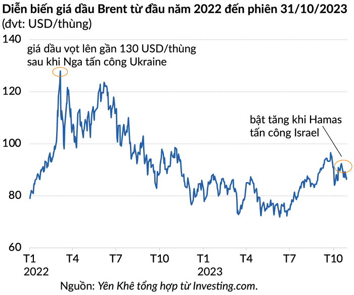 Kéo theo đó là giá dầu Brent chuẩn quốc tế đã tăng gần 18% kể từ mức đáy vào tháng 6 và có thời điểm nhảy vọt lên hơn 92 USD/thùng sau khi Hamas tấn công Israel.
