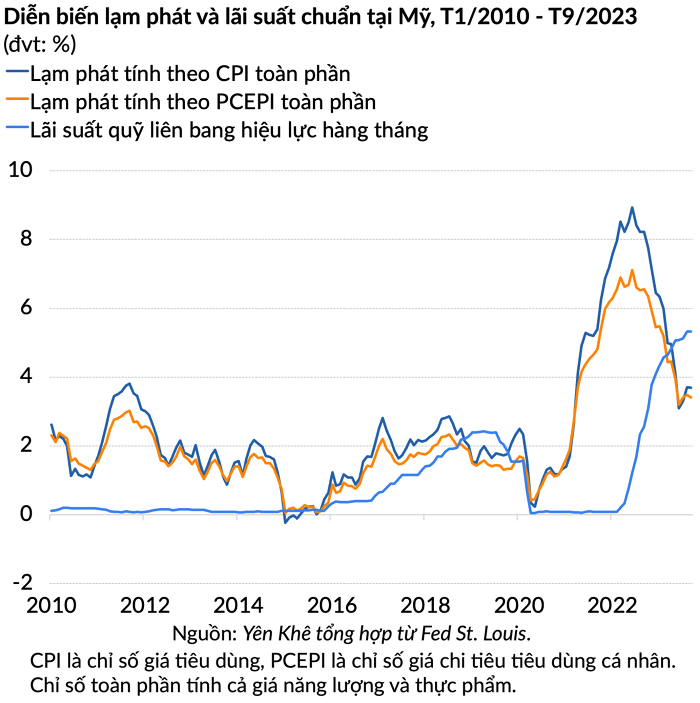 Đơn cử, lạm phát tính theo chỉ số giá tiêu dùng (CPI) của Mỹ đã hạ từ mức 9,1% vào tháng 6/2022 xuống còn 3,7% vào tháng 9, nhưng vẫn cao hơn mức mục tiêu 2% của Fed. Kể từ tháng 3/2022, ngân hàng trung ương Mỹ đã nâng lãi suất 525 điểm cơ bản lên mức cao nhất trong 22 năm.