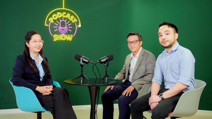 Ông Phillip Lam (bên phải), Giám đốc điều hành Công ty Cổ phần Nhãn Bao Bì Vi Na Úc và PGS.TS ông Nguyễn Hồng Quân (giữa), Viện trưởng Viện Phát triển Kinh tế Tuần hoàn (ICED), Đại học Quốc gia TP.HCM thảo luận trong podcast tập 3 của Việt Nam Xanh - Ảnh: BẢO DUY
