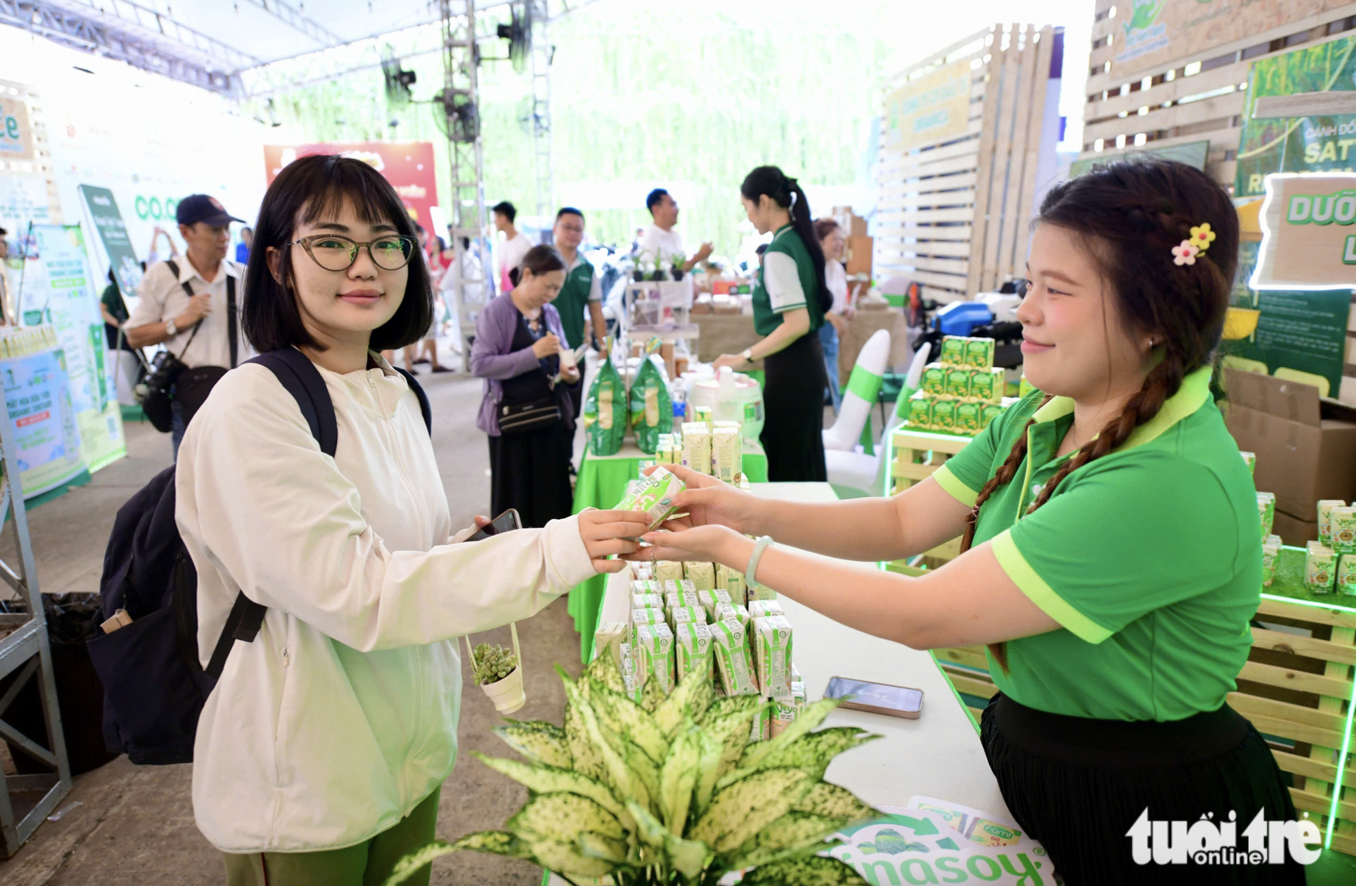 Một bạn trẻ nhận quà từ gian hàng Vinasoy tại Ngày hội Việt Nam Xanh 2025 - Ảnh: QUANG ĐỊNH